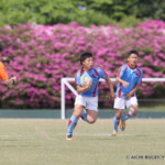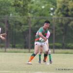 後半に入り、キックオフのボールを愛知Bが確実にキャッチ、展開すると、⑪藤田が縦に切れ込み、50mを走り切り右隅へトライ、⑨犬飼が難しい角度のゴールを成功させ、14-14と同点に追いつく。