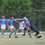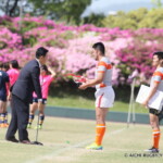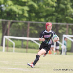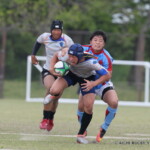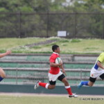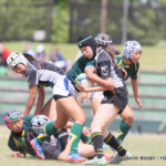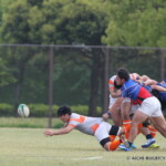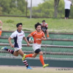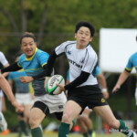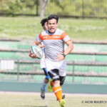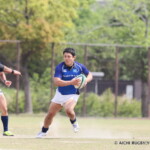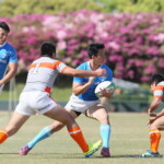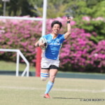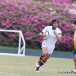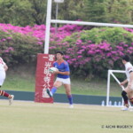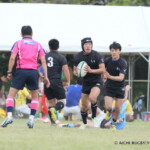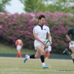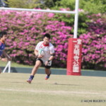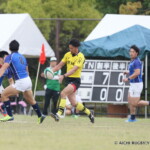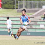 後半も白熱した試合が続く、後半キックオフからノーホイッスルトライを山口⑪横山が決めると、さらに、山口は、後半2分に自陣10m 付近からのゴロパント、左サイドを駆け抜けた⑦浜村が拾い上げ、そのままトライ、22-12とする。