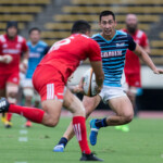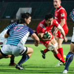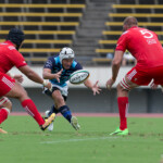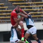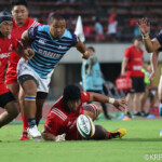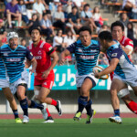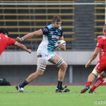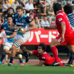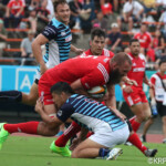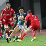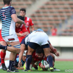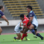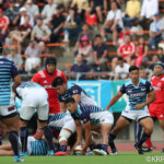 ボールを持つと縦に攻め込むサニックスに対し、グラウンドを広く使い攻める神戸製鋼、激しいブレイクダウンを繰り返すも、なかなか得点圏へ進むことができない。