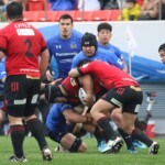 ご覧の通り、ディフェンスの幅をもっととった。選手の判断のところだ。日本の高校・大学でラグビーを経験してきた選手達は結構ラックに寄ってしまう傾向がある。それをしてしまうとディフェンスの幅がかなり狭まってしまう。練習でいろいろな状況をつくり、状況に応じてブレイクダウンで仕掛けるべきなのか、そうでないのかを徹底した。タックルテクニックにはまだまだ課題が多い。自分達のタックル成功率はトップリーグで10位だ。