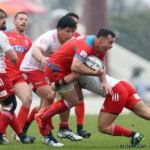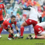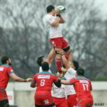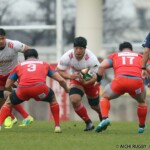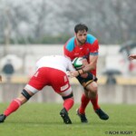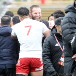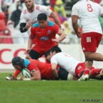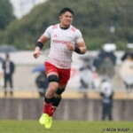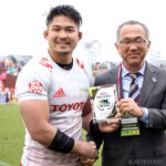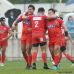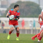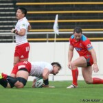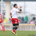 それでも前半33分、相手陣のラインアウトから乱れたボールを⑩クロニエが冷静に処理し前進、チャンスを伺うと⑦姫野が抜け出し中央にトライ、コンバージョンも成功し7-0と先制する。