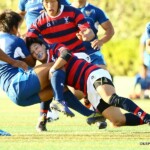 京都産業大は開始早々スクラムで近畿大を圧倒、PKを獲得し、ショットを選択、10番・高原が決めて、先制した。強いFWを前面に出してきた。一方近畿大はこれまでの勢いの通り、展開を中心にキックを織り交ぜて対校。9分には京都産業大ゴール前ラックから12番酒井がインゴールへショートパント、自らおさえてトライ、逆転する。自らゴールキックを成功させ、得点は3-7となった。