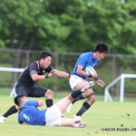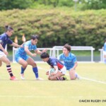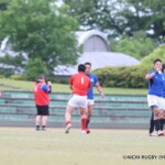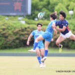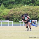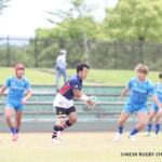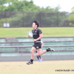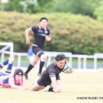 前半4分、大阪が自陣からキックで相手陣10m付近左側へ蹴りこむと、愛知⑬山下がキック処理で戻りながらボールを拾い上げると相手タックルをかわし、⑪塚本へ大きく左へパス、⑪塚本はパス受けると、スペースを走り抜け、ゴールポスト左へトライ、5-5の同点とする。