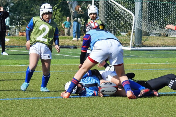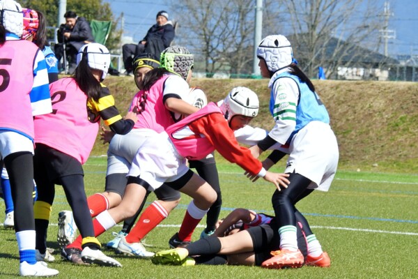 今大会では、7府県28チームから69名の参加があり、遠くは愛媛県・愛知県からの参加がありました。女子選手だけの大会となり、従前の大会とは異なった和やかな雰囲気となり、試合はコンバインドチーム(5チーム)ではありましたが、すぐに仲良くなって、試合だけでは満足せず合同練習も実施してました。天候にも恵まれ2月ではありましたが4月初旬のような気候で絶好のラグビー日和でした。