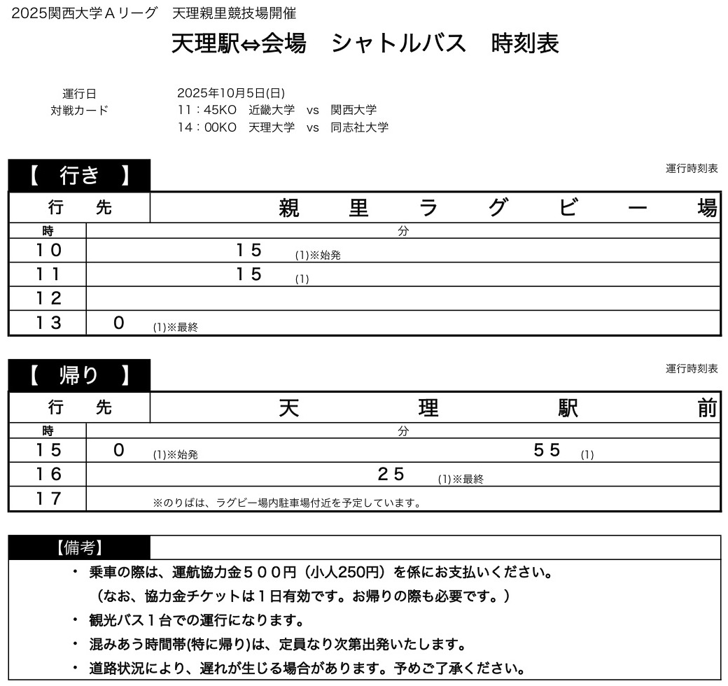 10月5日(日)に開催いたします、天理親里競技場での関西大学Aリーグの試合につきまして、天理駅から会場までのシャトルバスを運行いたします。