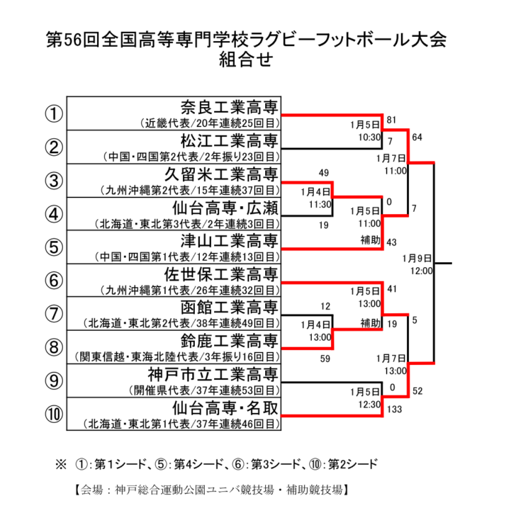 第56回全国高等専門学校ラグビーフットボール大会3日目・準決勝の結果を発表します。