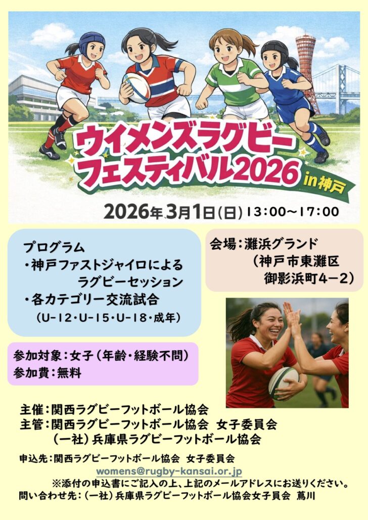 2026年3月1日(日)灘浜グラウンドにて、ウィメンズラグビーフェスティバル2026 in 神戸を開催します。