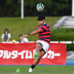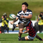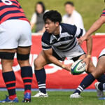 しかし、ここからは京産大タイムとなる。5分、敵陣22M付近のラックから⑨(SH土永旭)→⑫(CTB家村健太)→⑬(CTB小野麟兵)とパスを繋ぐ、⑬小野が2人を交わしゴールポスト下にトライ。SO⑩西仲隼がゴールを決めてあっさり逆転。(7-3)