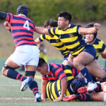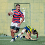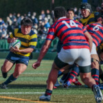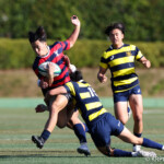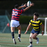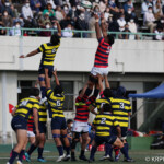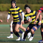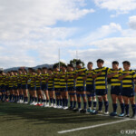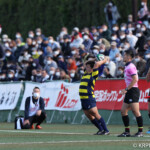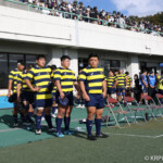 後半、京産10番西仲のキックでリスタート。後半開始早々に得点したのは京産だった。 1分、敵陣ゴール前からの立命館のキックをFL7番松永壮太朗がチャージ、そのボールが京産に入り右に、CTB13番小野麟兵が突破に成功して右中間にトライし得点差を広げる。(10番G成功、7−35)序盤から中盤は京産の時間帯となる。7分、前半と同じような形で4番ソロモネが左ゴールポスト横にトライ。(10番G成功、7−42)12分、敵陣左のラインアウトからモール、SH9番土永旭が左に潜り込みWTB22番西浩斗にパス、西が左中間に回り込んでトライ、得点差を広げていった。(10番G成功、7−49)立命館は16分、京産の反則から京産ゴール前5mのラインアウトからモールを押し込み、出来たラックから10番山下が右にキックパス。それがWTB14番安井拓馬に見事に通り、右隅にトライ。難しいゴールも12番宮嵜が決め14−49とした。しかしここから得点が動かなくなる。京産がボールを支配するが、前半同様にラインアウトでミスが出てリズムに乗れず、22mL内に入れない。得点が動かないまま試合終了を迎えるかと思われたが、39分、LO19番堤田京太郎が密集サイドをついて左中間にトライ。(G不成功、14ー54)最後は京産が蹴り出して試合終了、立命館は2勝2敗勝点8、京産は4勝勝点20として第4節を終えた。
