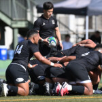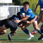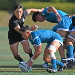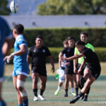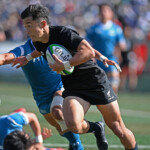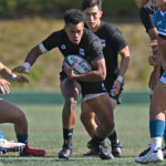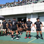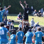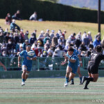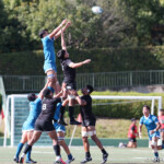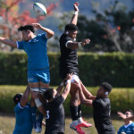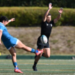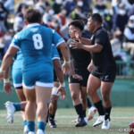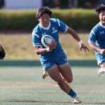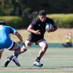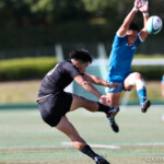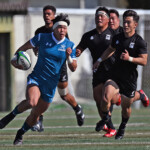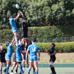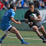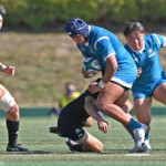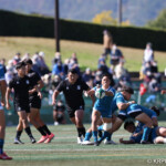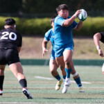 ⑧パトリック・ヴァカタは、ゴール前でタックルを受けながら、サポートで走り込んだ⑨北條へパス、左中間へトライ、⑩福本のゴールも決まり、10-0とリードを拡げる。