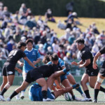 一方、天理大も、近大のラインアウトからの展開のなかで、近大⑦岩本がゴール左隅を狙ったランを二人がかりであと1mのところでタッチライン外へ引きずり出す。