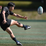 天理大は、自陣10m内側左での近大ラインアウトでのスローイングミスのボールをダイレクトに⑨北條がキャッチすると、相手陣22m内側左タッチライン沿いへキック。