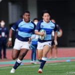スコアが動いたのは7分、先制は摂南大。敵失でゴール前5Mラインアウトの機会を得る。ラインアウトにBKの留学生も入れ強力な布陣で臨む。モールを組むも押し切れず、プレーオンのコールで密集から強引に抜け出したLO⑤ヴェティ・トゥポウが力ずくのトライ。ゴールはSO⑩大津直人が決める。(0-7)