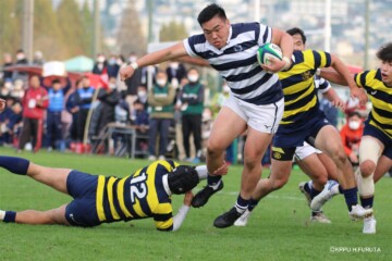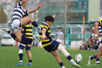 このままでは終われない関大。なかなか有効打が出なかったが、21分、敵陣での展開からLO④中薗拓海がブレイク、フォローのSH㉑溝渕元気にパス、そのまま走り切り、ゴールポスト下にトライ。ゴールはFB㉓立石和馬が決める。(7-28)