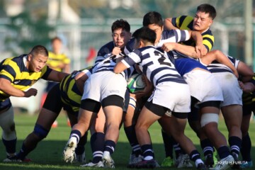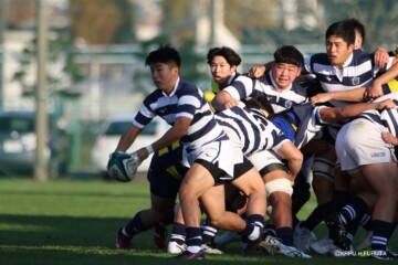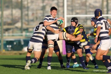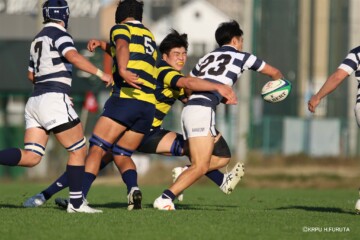 この後も立命大ポゼッション有利な展開を続け、22分、相手反則のアドバンテージを生かしゴール前に迫る。最後は②中川がラックから持ち出しトライ(ゴール成功)を決める。(0-14)