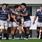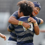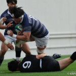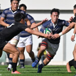 後半も最初にチャンスを掴んだ同志社大、23分に敵陣ゴール前5m右ラインアウトからモールを形成しそのままゴールまで持ち込みHO⑯長島が右隅にトライ、GKも難しい角度からSO⑩大島が成功。14-35