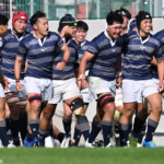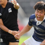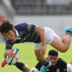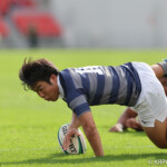 26分再び同志社大が敵陣10m中央からロータックルで相手の落球を誘発したNO8⑳奥平都太郎が自らゴール前5mまで持ち込みSH⑨新和田錬からパスを受けたSO⑩大島が右中間にトライ、GKもSO⑩大島が成功。14-42
