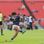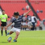 17分に再び同志社大が中央付近で相手のキックをチャージしたSO⑩大島が自らキックして、そのまま左中間に押さえトライ、GKもSO⑩大島が成功。7-21