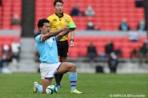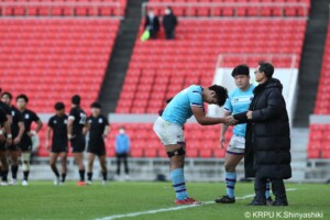 今日はありがとうございました。先週の同志社にああいう負け方をして落ち込むときもあったんですけどしっかり切り替えて、これまで一週間いい準備をしてきて今日のゲームすごい自信をもって挑めたんですけど、筑波大学さんのプレッシャーだったり、ブレイクダウンで少し受けてしまって、天理大学に前半入ってすぐシンビンが出たり、それでも元気出してみんな声出してがんばってきたんですけど、そこでプレッシャー受けてなかなか天理大学の流れにもってこれず強みを多く出せなかったなというのが印象です。最後まで自分自身としては、大事な試合で後半のはじめに出てしまってこのゲームに関しては悔いが残るゲームだったんですけど、最後まで4回生筆頭によく声出し合ってくれたので来年につながる良いゲームであったと思います。