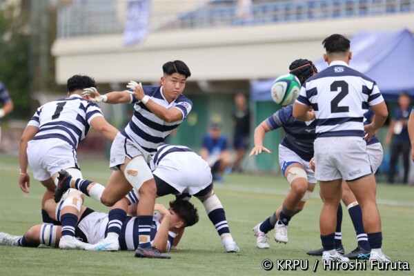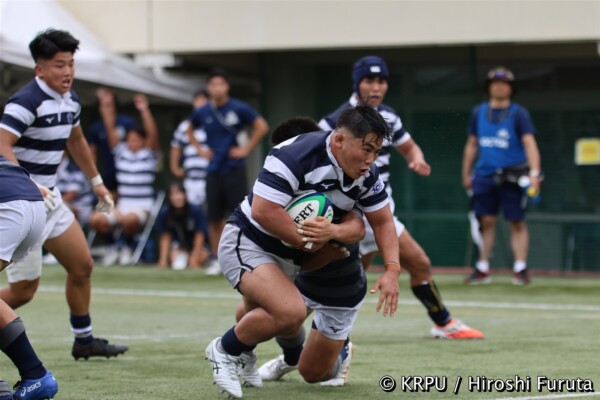 疲れが見え始めた後半からギアーを上げた関大は27分、敵陣ゴール前左ラインアウトからモールを形成し押し込み最後はHO②垣内が左サイドから左中間に飛び込みトライ、GKもSO⑩池澤が成功。28-29