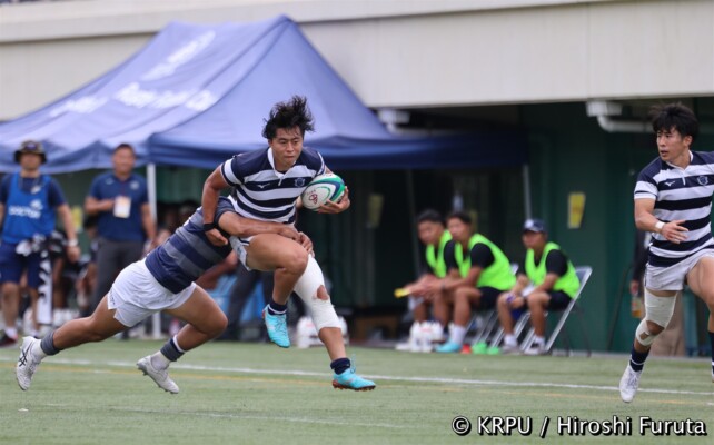 28分、再び同志社大がセンターラインから攻めWTB⑭岩本総司がデフェンスを巧みに交わしパスを受けたWTB⑪上嶋友也が左中間にトライ、GKもSO⑩嘉納が成功リードを広げる。7-19