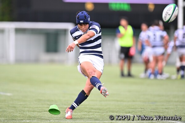 39分、ペナルティからチャンスを掴んだ関大は敵陣右中間5mからショットを選択し約45mのPGをSO⑩池澤が成功逆転する。31-29