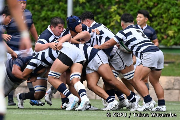 19分には関大が敵陣ゴール前7m右ラインアウトからモールを形成しそのままゴールまで持ち込みHO②キャプテン垣本大斗が右中間にトライ、GKもSO⑩ 池澤佑尽が成功同点。7-7