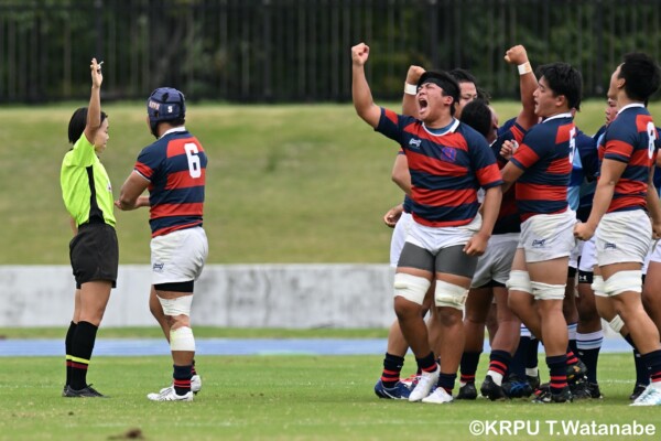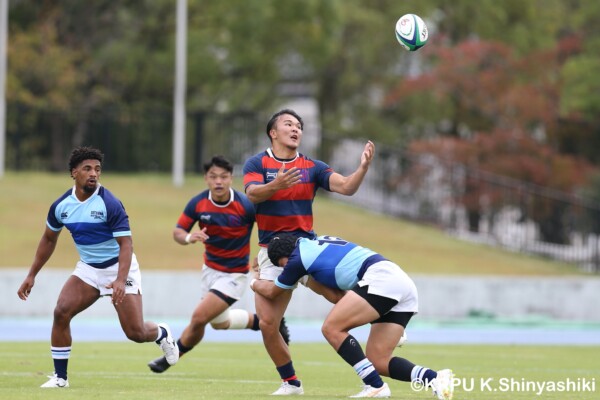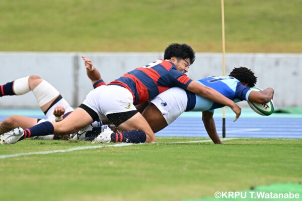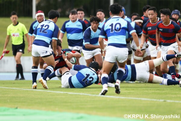 齋藤がドロップキックした敵陣22m右中間のボールを、摂南大がノックオンしボールを拾ったFL稲垣直希からパスを受けたHO平生が走り切り右中間にトライ。GKSO齋藤が成功。277