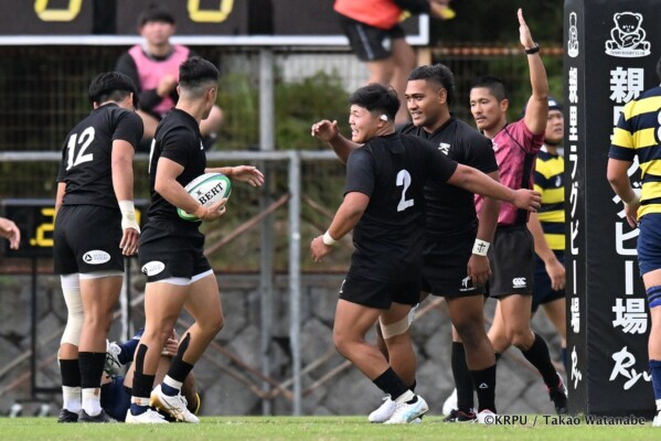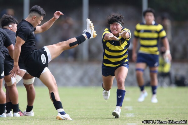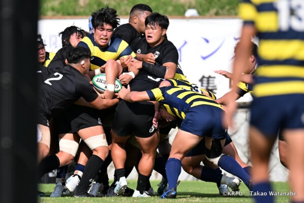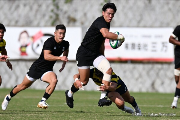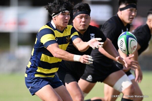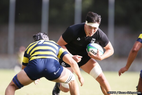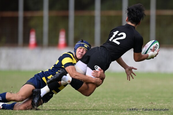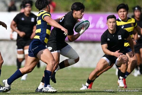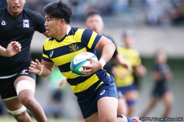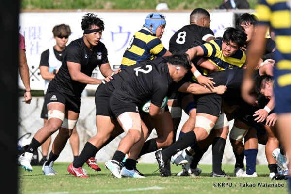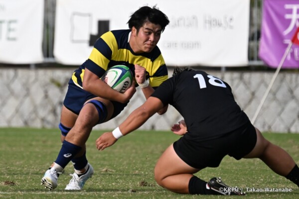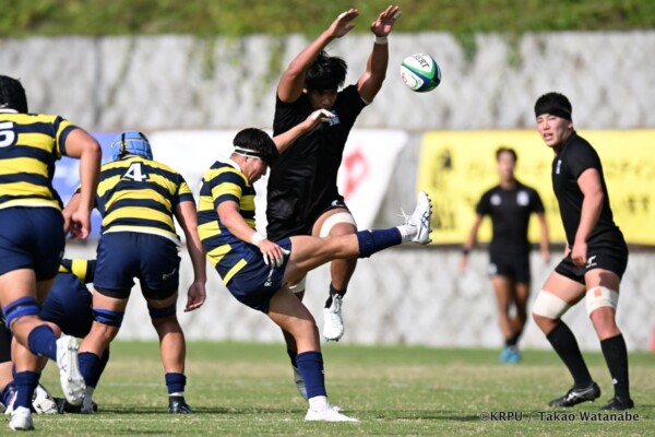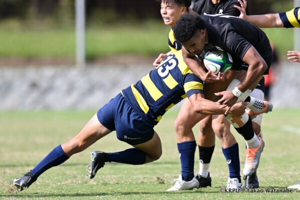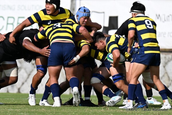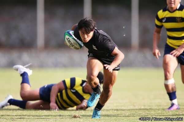 32分はHO⑯稲嶺翔太、37分にはSH㉑高岸尚正(SO㉓中村仁GK成功)、最後は42分⑪藤原のトライ(GK成功)で10トライと立命大を寄せ付けず、今シーズン初めての完封勝利の4連勝(勝点19)でリーグ後半戦(前年度上位校との対戦)に向かう。(68-0)