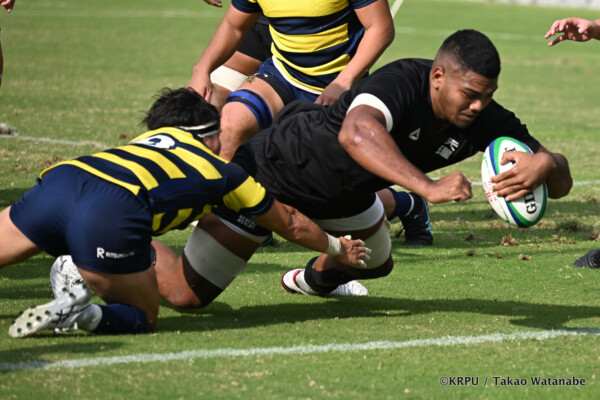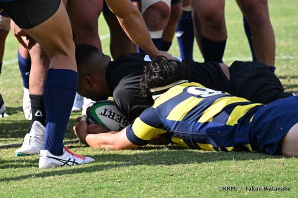 終盤32分、天理大はゴール前5Mスクラムを得る。今度は押し切れないが立命大FWに十分に圧力をかけ封じ込める。一旦SH⑨北條拓郎がサイドに持ち出し、ボールをピックした⑧ヴァカタが力づくでゴールラインを割りタッチダウン(GK成功)、リードを広げる。(14-0)