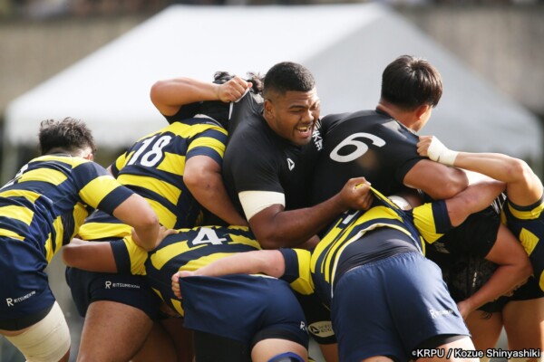後半のファーストスクラムも天理大が圧力をかけ、立命大のコラプシングの反則でペナルティーを得る。そこからタッチに蹴りだし、ラインアウトでもモールで圧力をかけ、また立命大がコラプシングの反則を繰り返す。