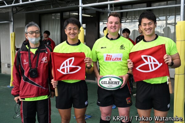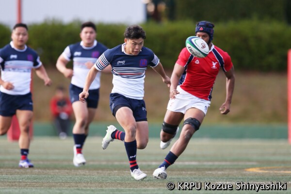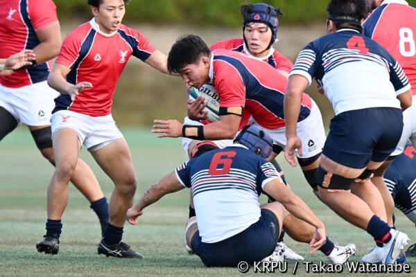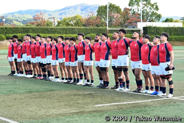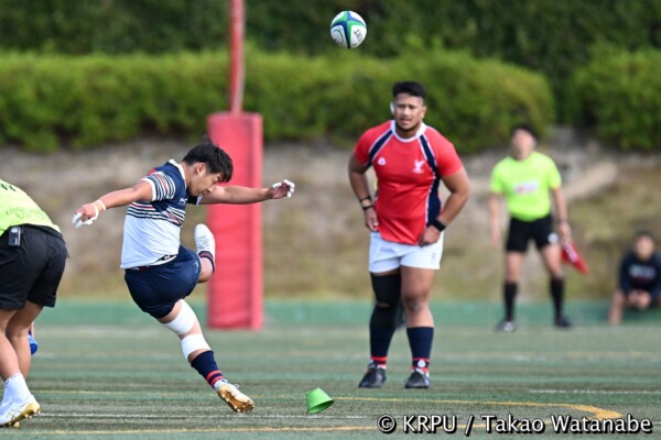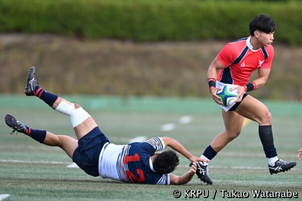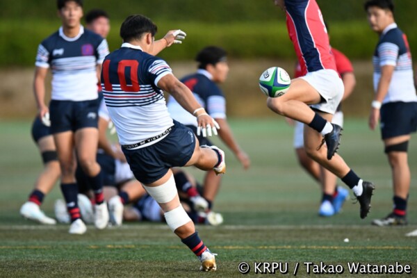 ムロオ関西大学Aリーグ第5節、いよいよ昨年度の上位校同士の対戦が始まる。まずは、昨年度優勝の京都産業大学(以下、京産)と同4位関西学院大学(以下、関学)が、京都宝ヶ池公園球技場の第2試合で対戦した。今季共に無傷の4連勝で向かえた両チーム、今期の優勝を左右する一戦は、京産SO⑩吉本大悟のキックで開始する。