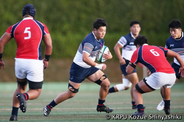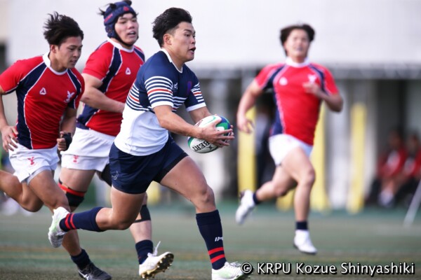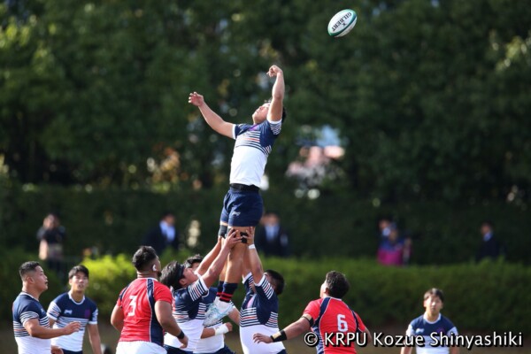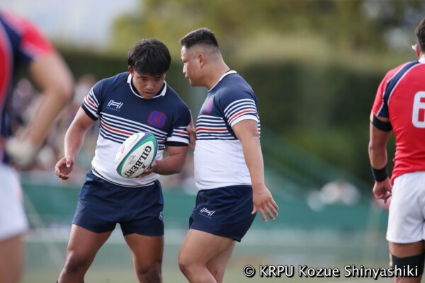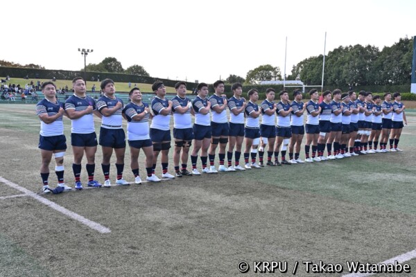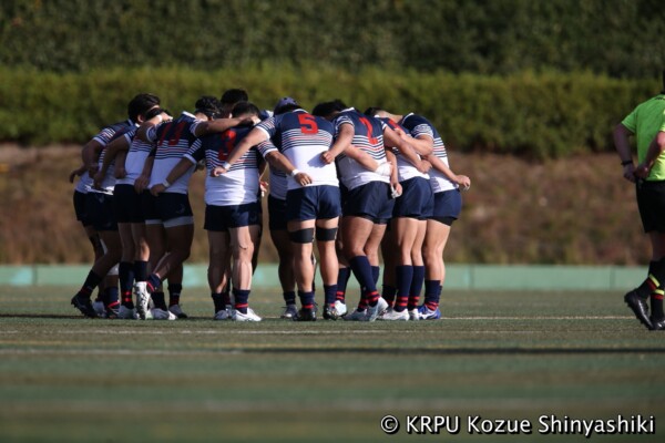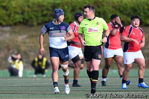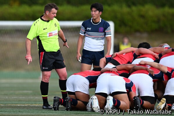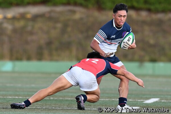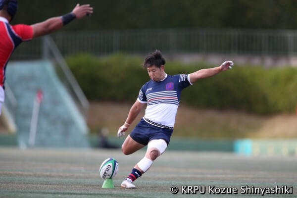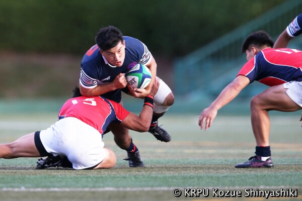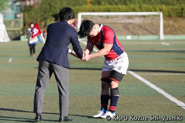 4戦全勝同士で、関西学院大学さんはフィジカルが非常に強いので、我々もそこで負けずに必ず勝ちたいという思いでのぞみました、前半は関学大さんのプレッシャーを受けましたが、うちも得点にはつながらなかったのですが、FWでプレッシャーをかけ続けて、終了間際のトライでようやく主導権を握ることが出来たと思っています。