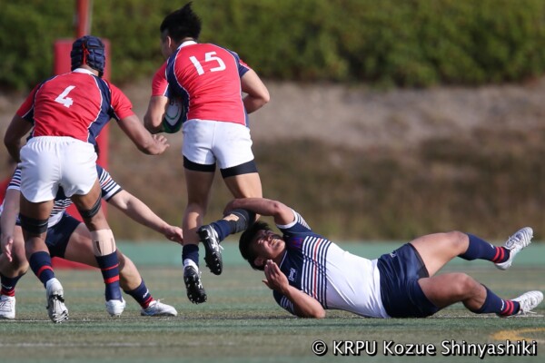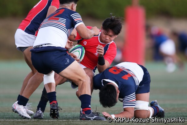 春の京都産業大学戦で、中盤で20~30メートル押されるシーンがあったので、それをさせないために先ずは入らずに、相手が出てきたらジャンパーにタックルという作戦でした、そこは練習でやってきたのでうまくいった部分もあり、ゴール前も春からやってきたインパクトの部分や足をかいてドライブするところは、留学生がいる京産大相手にも通用したと思っています。