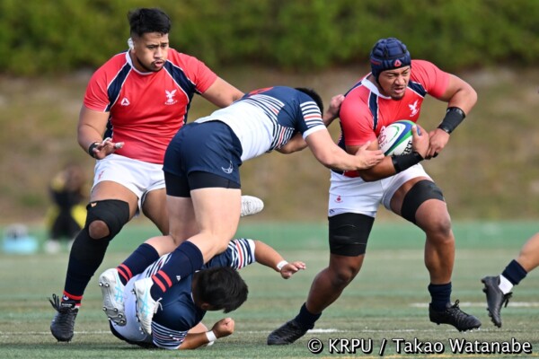なんとか反撃したい関学は、10分に右中間40mのPKを⑩齊藤が狙うが惜しくも失敗、点差を詰められない。ここから京産の猛攻が始まる。12分、⑩吉本の50/22mキックで関学陣右22mL内に入ったLOから、最後はPR③ヴェア・タモエフォラウが右中間にトライ。(⑨土永GK成功、24-9)