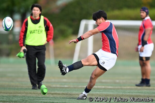 すると次は京産。自陣10m中間のスクラムからSH⑨土永旭からブラインドサイドのWTB⑭松岡大河へパスアウト。松岡が鋭いステップで敵陣22mLまで迫ると、関学がたまらずオフサイド、12分、中央25mのPKをFB⑮辻野隼大が決めて3-3の同点にする。しかし関学も続く15分に、中央30mのPKを⑩齊藤がきめて3-6、再び3点差とする。
