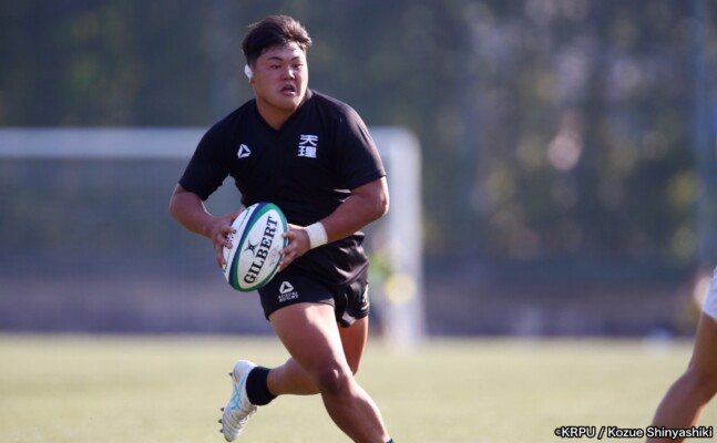 その後4分、同志社大のドロップアウトキックを、天理大は敵陣10M付近でキャッチ、NO8⑧パトリック・ヴァカタやFB⑮上ノ坊駿介のゲインで22M内まで運び、ラックを形成、こぼれ球を⑧ヴァカタがピック、そのままゴールポスト下まで駆け抜けトライ。GKはSO⑩筒口允之がきっちり決めてあっさりと先制する。(0-7)