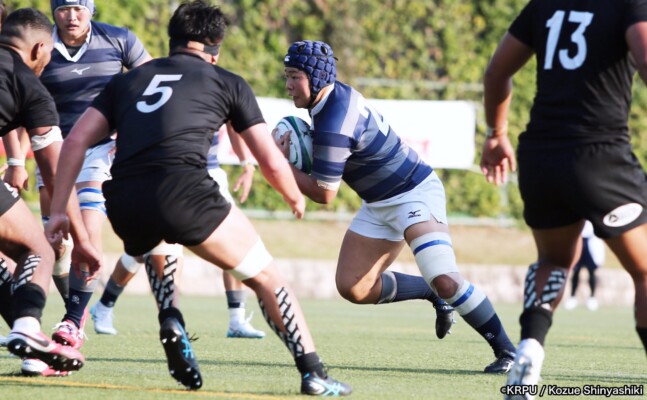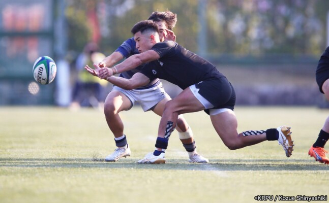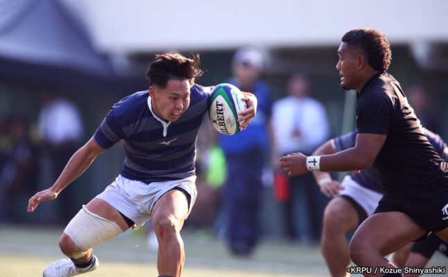 7分、同志社大のリスタートキックを自陣22M内から⑧ヴァカタやCTB⑫和田雄翔のビッグゲインで敵陣ゴール前まで運ぶ、最後は右サイドから走り込んできたWTB⑭上野颯汰が右中間にダイブトライ(GK成功)の追加点。(0-14)