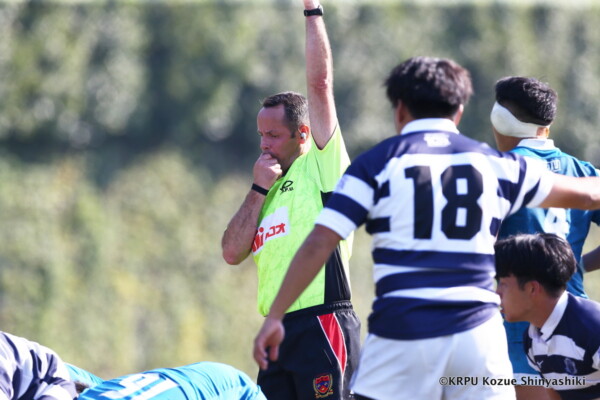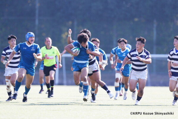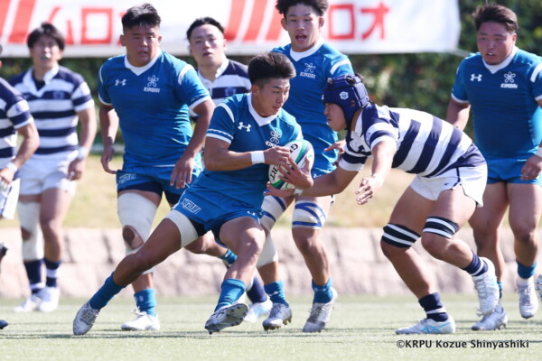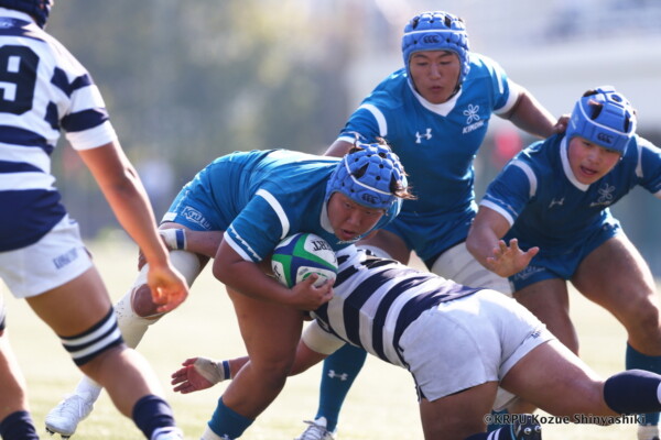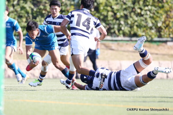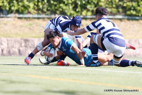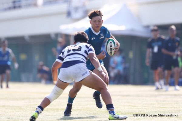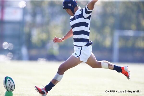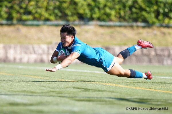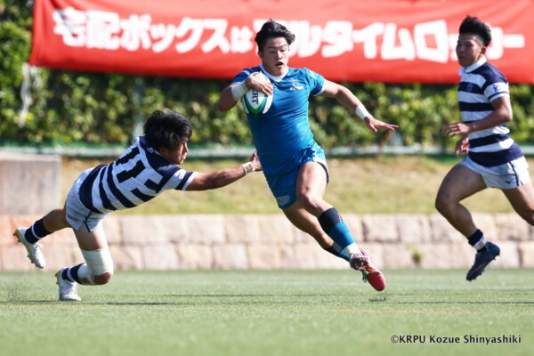 関大は再三ゴール前まで攻め込むが得点を奪えず苦戦したが、20分、近大のキックをチャージした関大WTB⑪立石和馬がタックルも行い相手を倒しフォローしていたCTB⑬吉良陸人が左中間にトライ、GK不成功。5-5