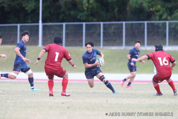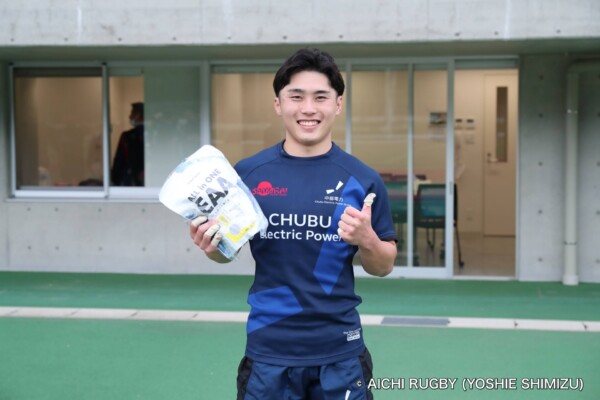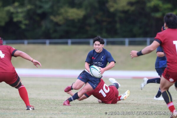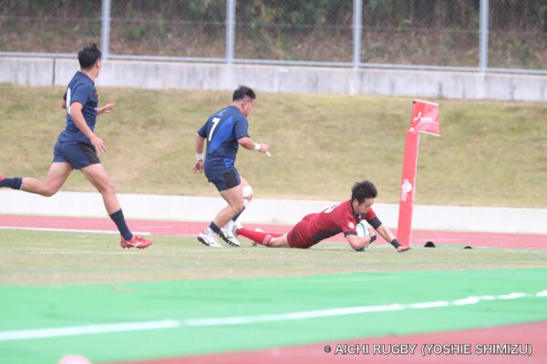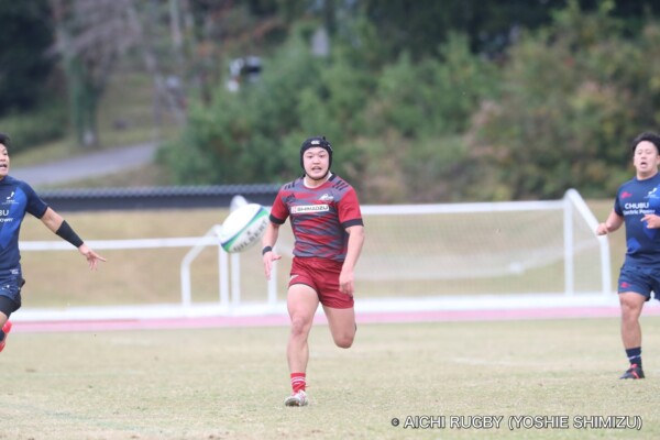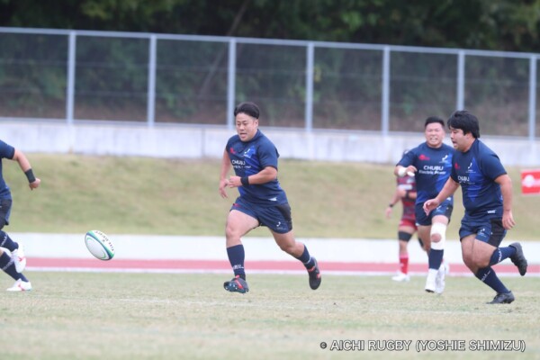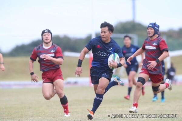 続いて前半14分、中部電力が連続攻撃する中、12番棚橋優大が絶妙なタイミングで飛ばしパス。パスを受けた11番鶴田桂樹が約40メートル走りきり、トライ、8-0。