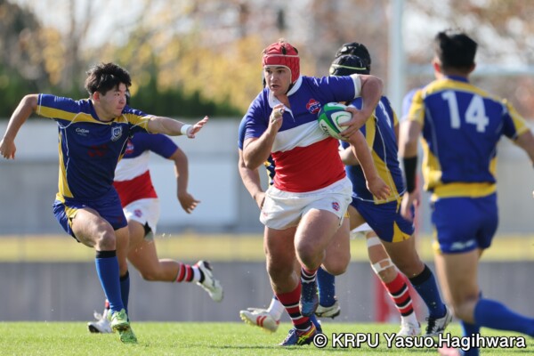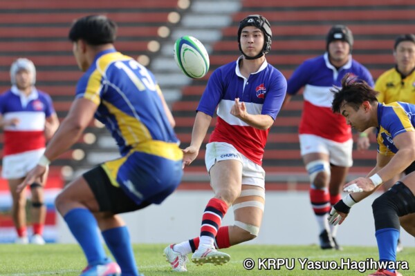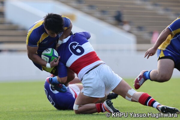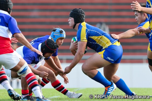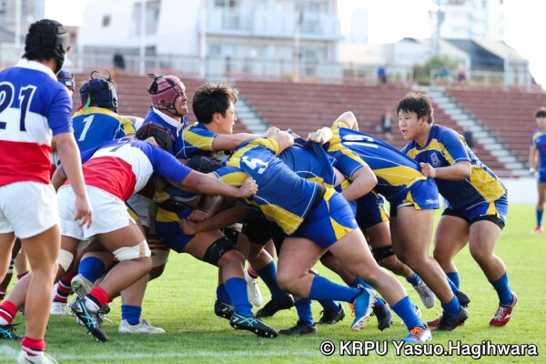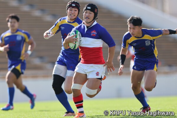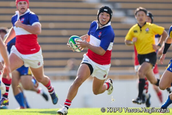その後、中京大学が2トライ(1ゴール成功)を重ね、前半ラストプレーでもトライ(ゴール成功)をあげ、52-15で前半を折り返す。