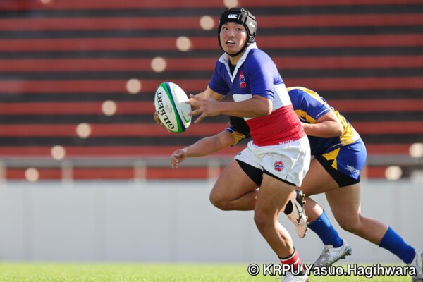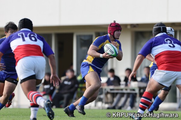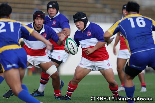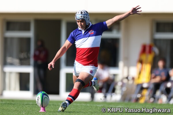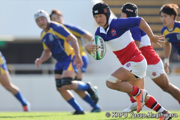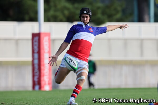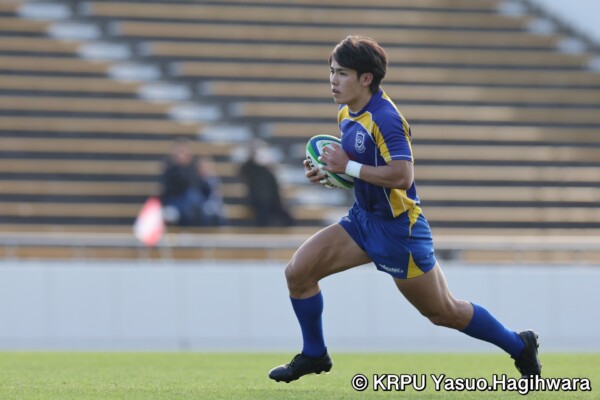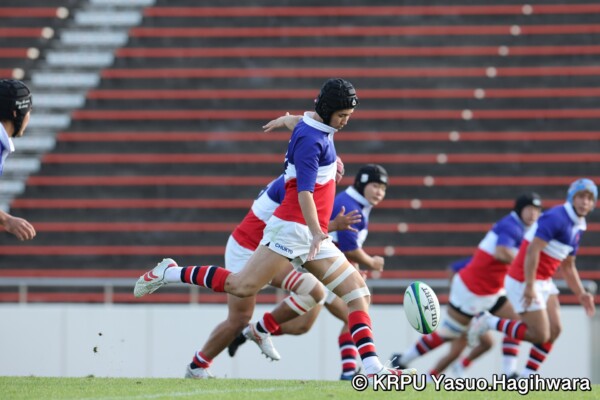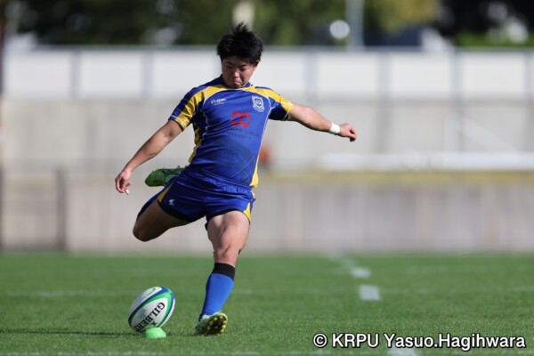 八戸学院大学は、後半35分、10番西野のコンテストキックを23番宝田(神)がキャッチしトライ(ゴール成功)、22-76。