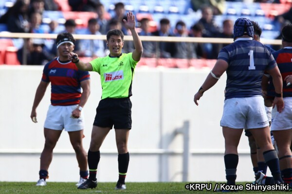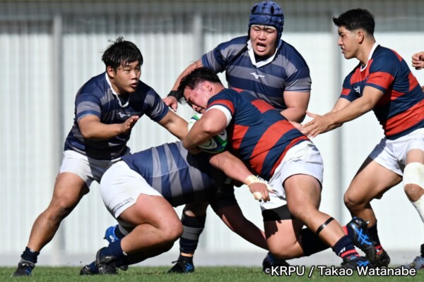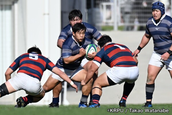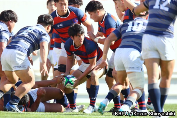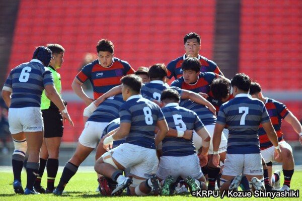 前半は両チームともスクラムで相手を崩したい意図が見えたが、互いにうまく合わせられず、またレフリーとのコミュニケーションが取れずとフラストレーションのたまる中で、激しいデフェンスで引き締まったゲームを展開したが、後半に入って、関学大のBK陣の機動力が同志社大のデフェンスを崩して結果的に大差のゲームになった。