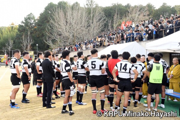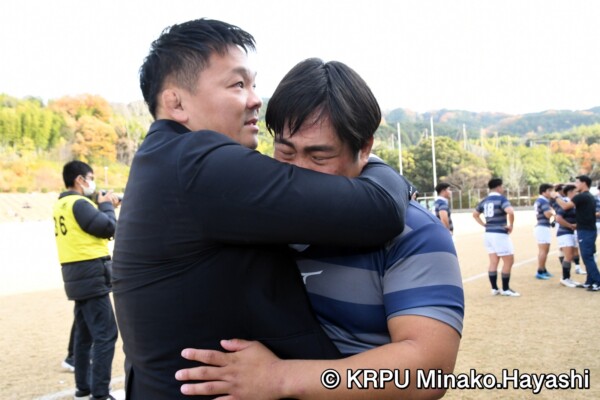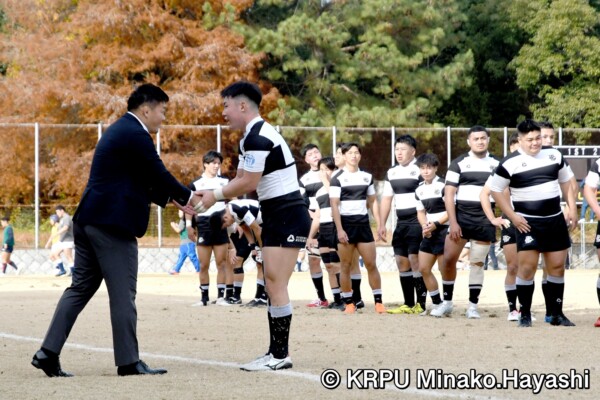 本日はありがとうございました。準備いただいた関西協会、奈良県協会に感謝申し上げます。また、良いゲームをしていただいた同志社大学にも感謝いたします。大阪体育大学としては、この入替戦は覚悟を決めた一戦であり、Aリーグへの昇格を志して練習してきました。前半は反則が多く、特にスクラムでのレフリーとのコミュニケーションが上手く取れず残念でした。ハーフタイムで、「自分たちは攻めるしかない、このままでは何も残らない」と言って後半に送り出しました。結果として、後半は、「自分たちはできる、得点を取れる」という感触を持ちながらゲームを進めました。最終的には点数を開けられ敗れましたが、大阪体育大学の誇りを胸に戦った学生たちに感謝しています。応援してくれた学生、学園並びに大学関係者も多く応援に来ていただき、大阪体育大学ラグビー部として良いゲームができたと思います。本日はありがとうございました。