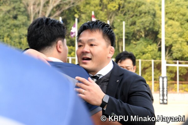 本日はありがとうございました。先週末の会見で、「今日は同志社を守る戦いになる」と申し上げましたが、その通り、学生たちが気持ちを見せてくれました。準備してきたことも100%やってくれました。最後の最後に最大の集中力を出してくれたのが、今日の結果(Aリーグ残留)になったと思います。大体大さんは激しく来ると準備していました。優位に進められたとは思いますが、ブレークダウンのところでやはり激しさを見せられ、しんどい時間もありましたが、最後まで集中力を切らさずよくやってくれたと思います。