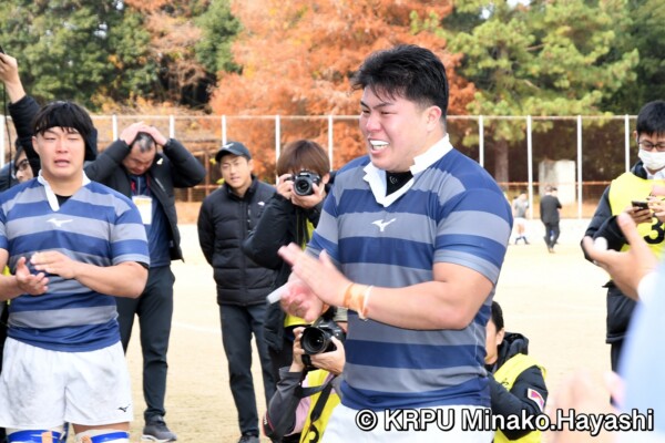前半、自分たちの想定していないことが続き、雰囲気を変えようとしましたが、なかなか自分たちのペースに持っていくことができずに終わりました。ハーフタイムで、「失うものは何もない、前に進んで点を取っていくだけだ。勝つことを信じている仲間、コーチ、保護者の思いを背負って戦おう」と気合いを入れ直しました。後半は、キックを極力使わずに、自分たちのラグビーを思う存分しようとしましたが、同志社さん相手でも通用する部分が見えました。前半からできていれば良かったですが、後半からでも勝負できることがわかって嬉しかったです。今年のチームは下級生がとても協力してくれました。また、一緒に支えてくれた4年生、コーチ陣、関係者に感謝しています。また、キャプテンとしてこの80分間を戦えたことに感謝しています。本日はありがとうございました。
