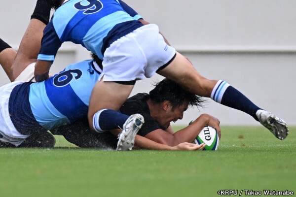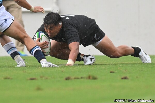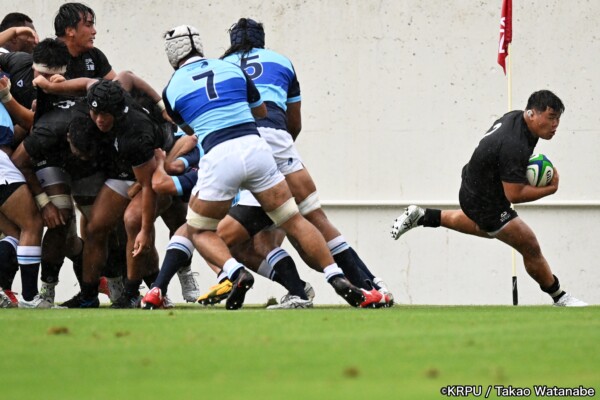 16分には天理大が敵陣ゴール前5m左ラインアウトから攻め、最後はラックからセンター⑬フィリモネ・サイアがボールを持ち出し、そのまま右隅にトライ、GK不成功。0-22