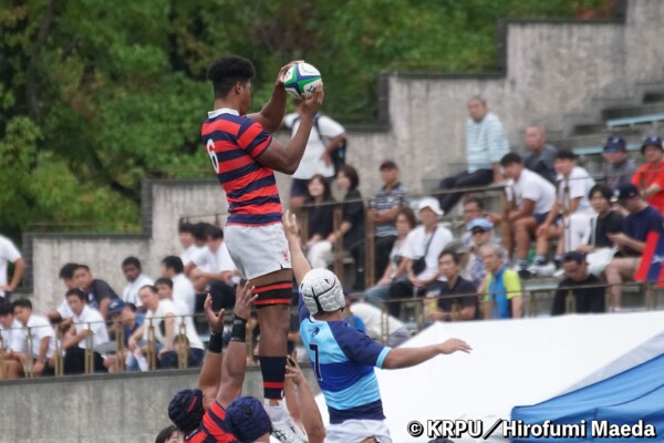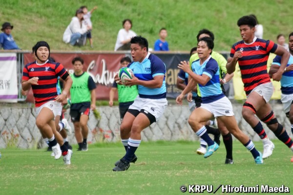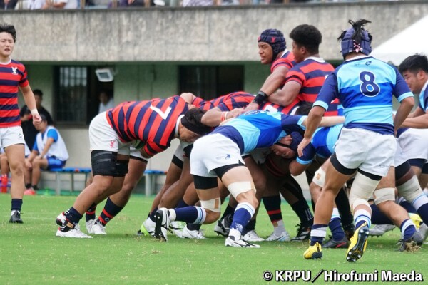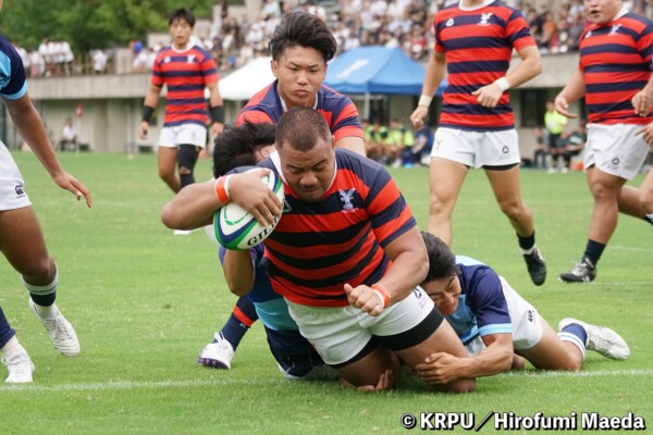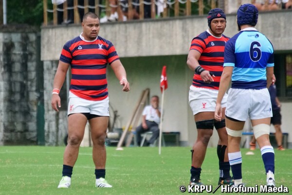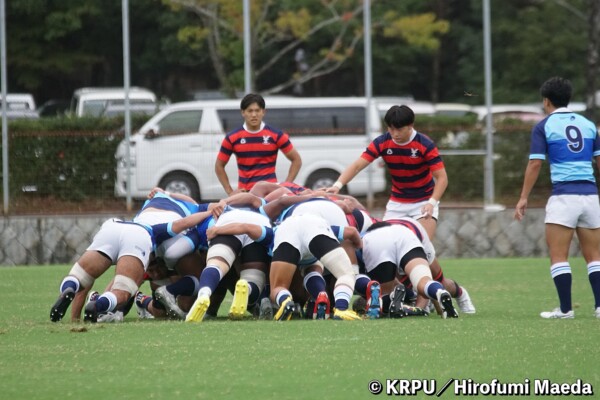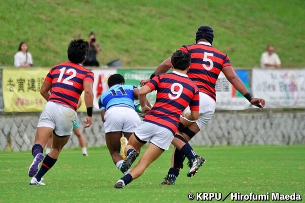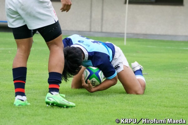 最初にチャンスを掴んだのは京産大12分、敵陣ゴール前5m右ラインアウトからモールを形成し最後はNO8⑧シオネ・ポルテレが右隅に先制トライ、GK不成功。0-5