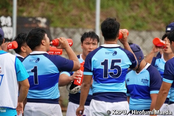 4分、摂南大が敵陣ゴール前15m右中間スクラムからフェーズを重ね、FB⑮前田晃明からHO②昇に渡り最後はWTB⑪マイケルズがゴールポスト下にトライ、GKもSO⑩川上が成功、ゲームが白熱する。21-24