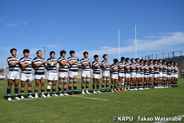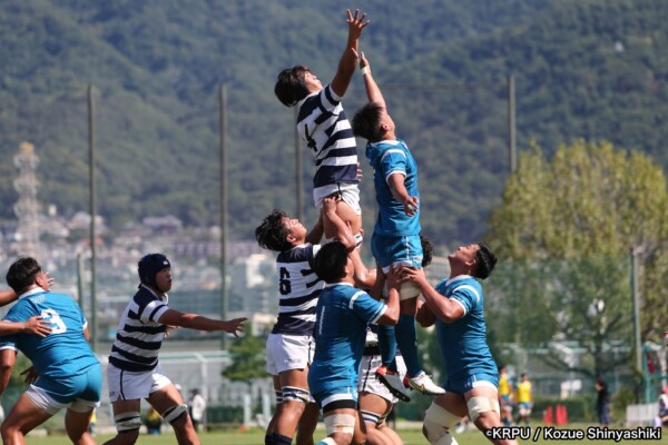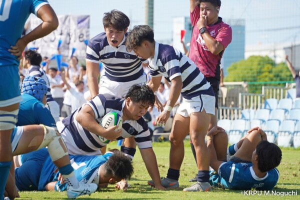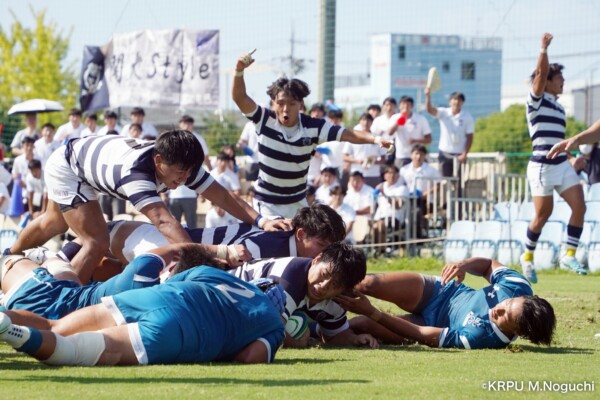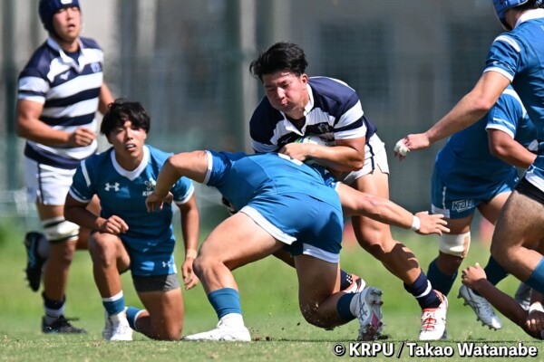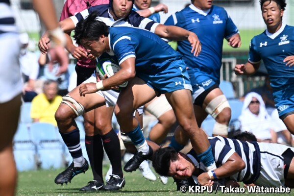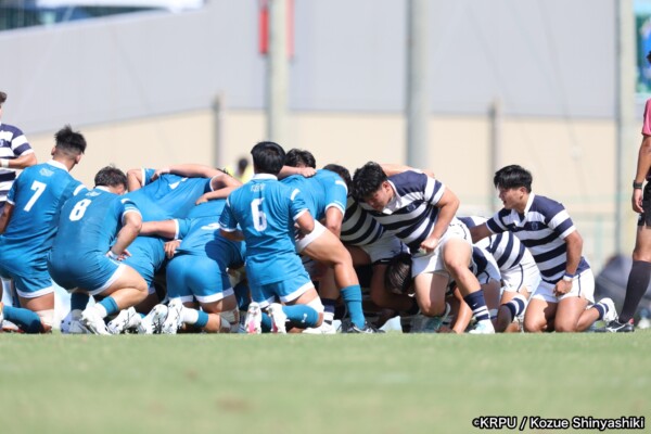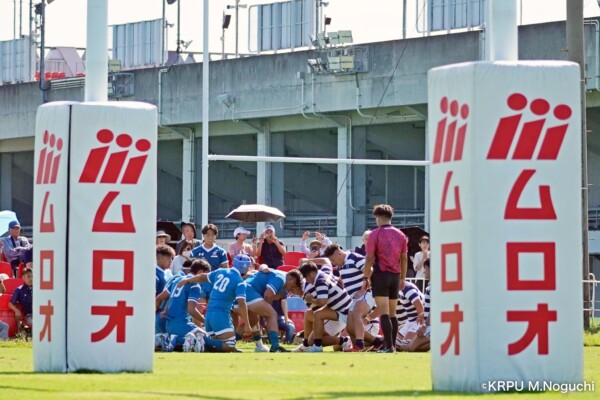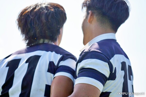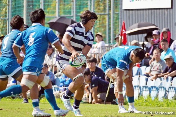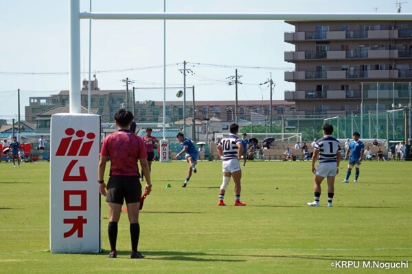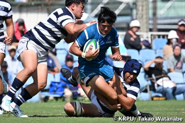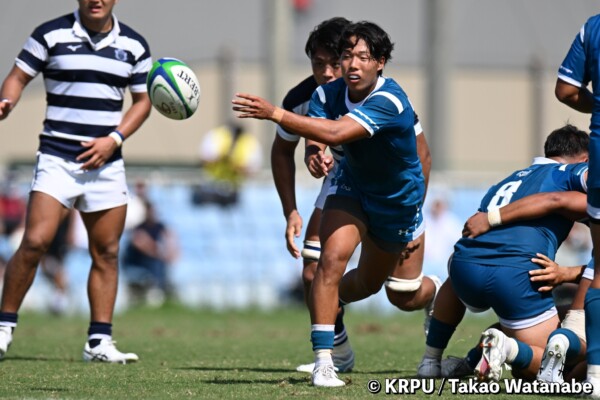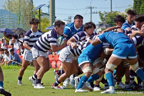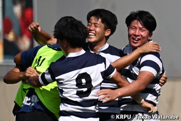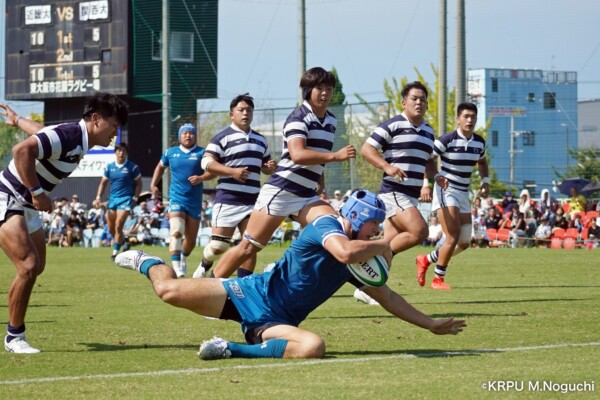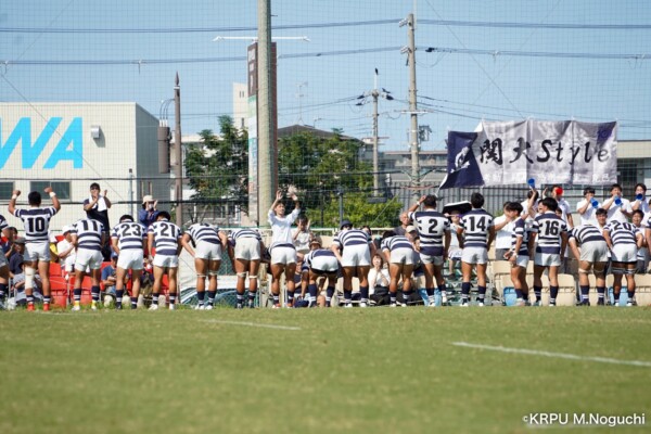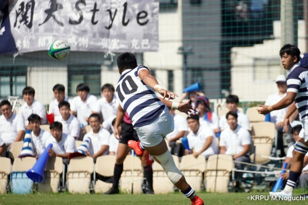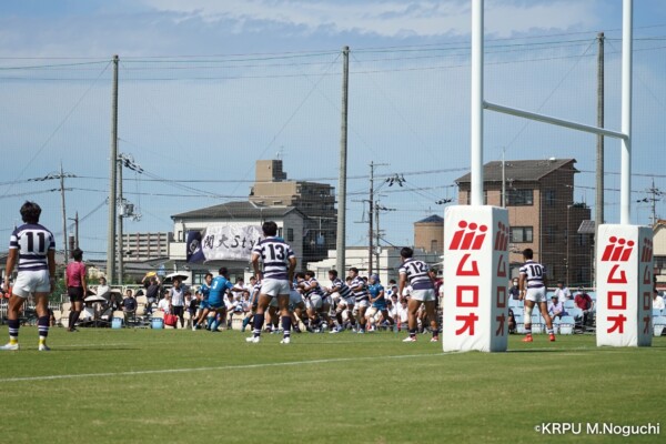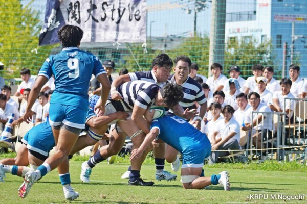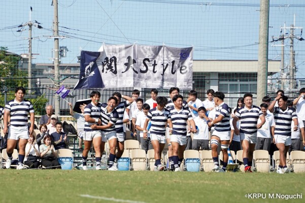 ロスタイム43分、関大は⑩崎田の見事な50/22のタッチキックから、ゴール前6M付近でのマイボールラインアウトの機会を自ら作る。モールを形成するも崩れ、FWがラックサイドから右サイドを攻める。途中から入った大きな体の1年生PR⑱森下陽希が右サイドを突くがとり切れず。また、次の機会にも右サイドを積極的に突くも阻止される。⑱森下の3度目の挑戦で左サイドを攻め飛び込んで逆転トライ(GK成功)し、関大はロスタイムの逆転劇で貴重な1勝をもぎ取った。(25-31)